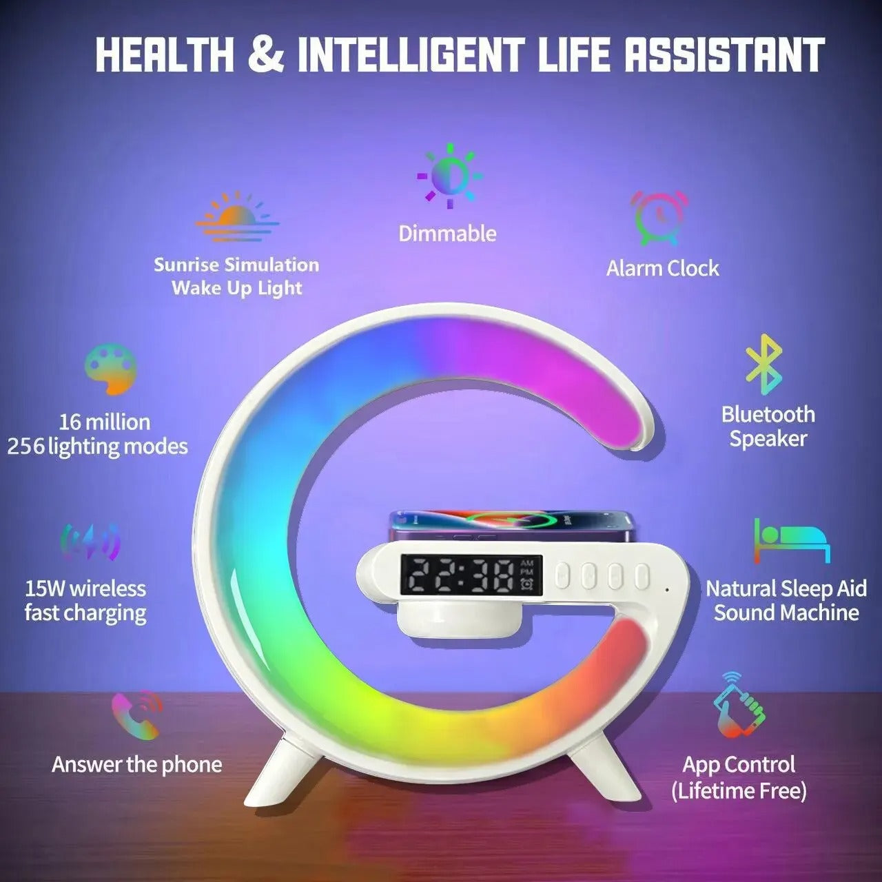 Lámpara G con cargador inalámbrico, luz ambiental que cambia de color RGB, luz nocturna regulable, altavoz Bluetooth, luz de estado de ánimo inteligente para dormitorio.😍